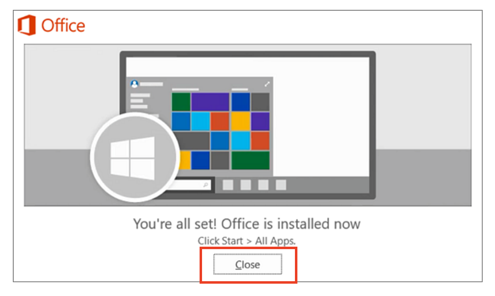 Your install is finished when you see the phrase, "You're all set! Office is installed now," and an animation plays to show you where to find Office applications on your computer, then select “Close” (Figure 3).